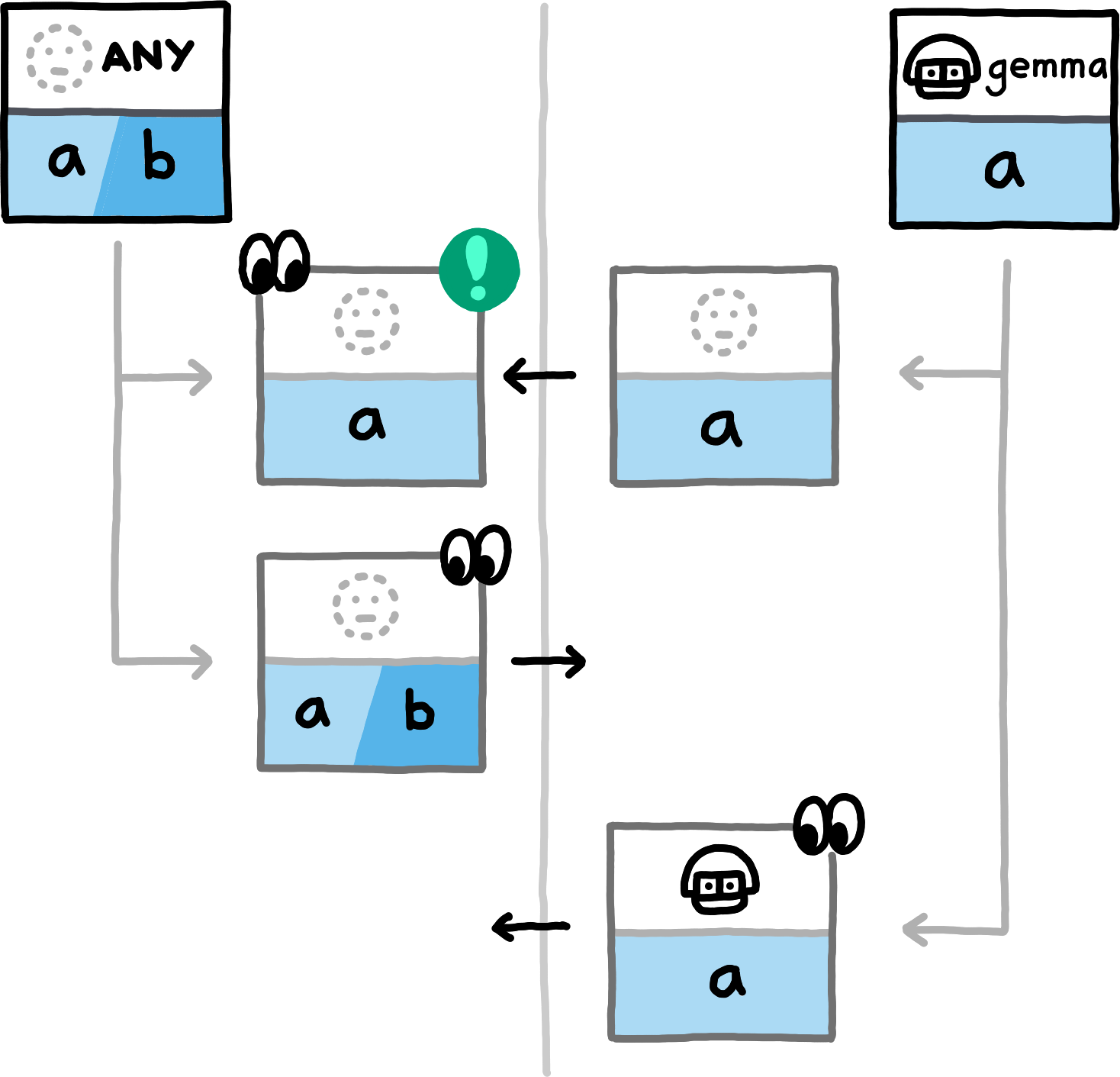 If you replace the concrete examples with the equivalence classes that they represent, you obtain a proof sketch for the correctness of this approach.The examples cover the nine different (up to symmetry) combinations of how subspace_ids and paths can related to each other (equal, non-equal, or any for subspace_ids, prefix, extension, or unrelated for paths). Note that in all examples, both peers also locally compute hashes for PrivateInterests with the empty Path. For brevity we do not depict those, since in these examples they never match any transmitted hashes.
