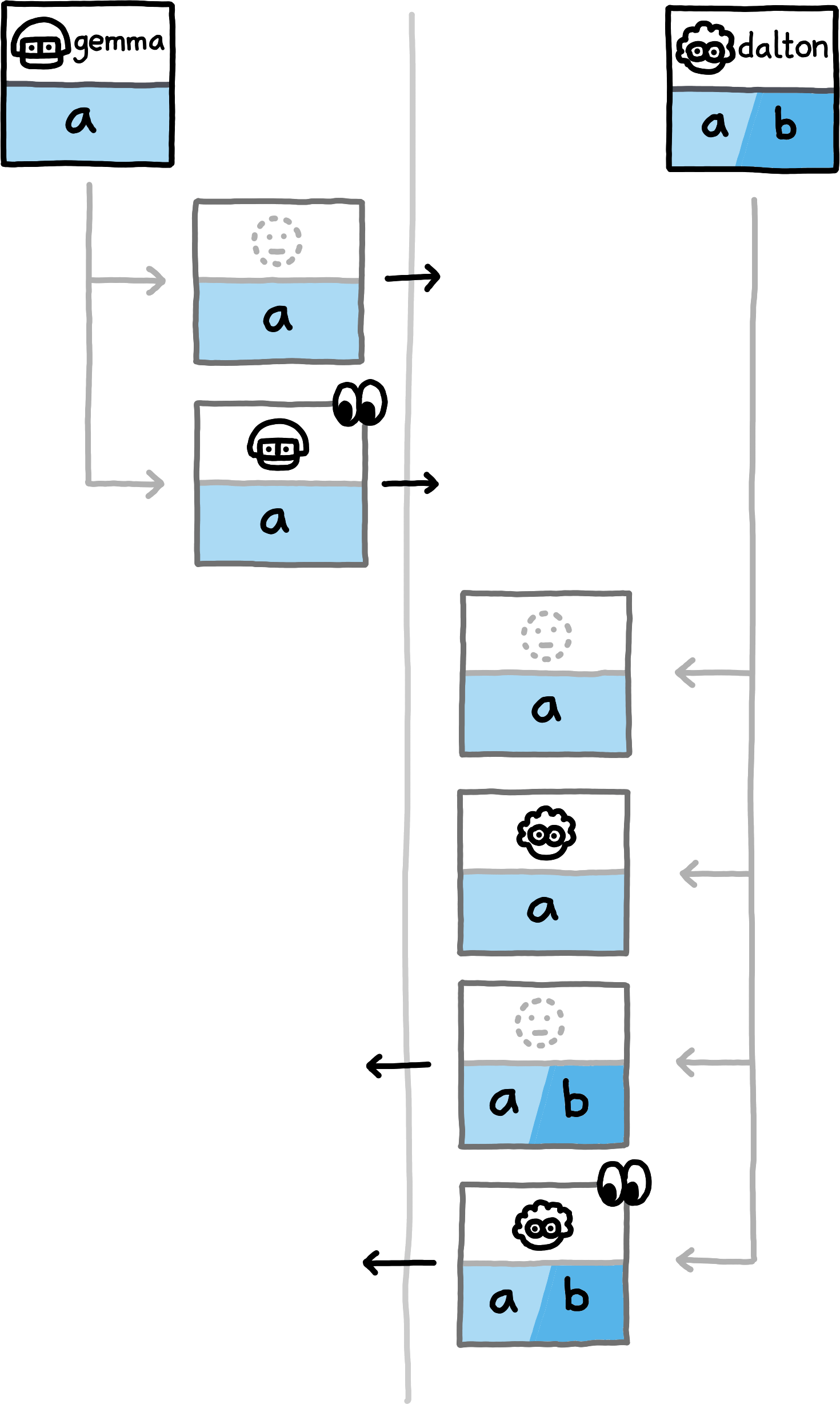 In addition to withholding information from unauthorised peers, we also wish to defend against active eavesdroppers. An active eavesdropper is an attacker who can read and modify all transmissions by the two peers. There exist well-known protections for settings where the two peers have prior knowledge about each other before they start the connection, but we also want to allow for sync between anonymous peers who do not know each other at all. Hence, even after the other peer has proven to us that they have access to some data, we still must be careful about what we send (or rather, how we encrypt it).